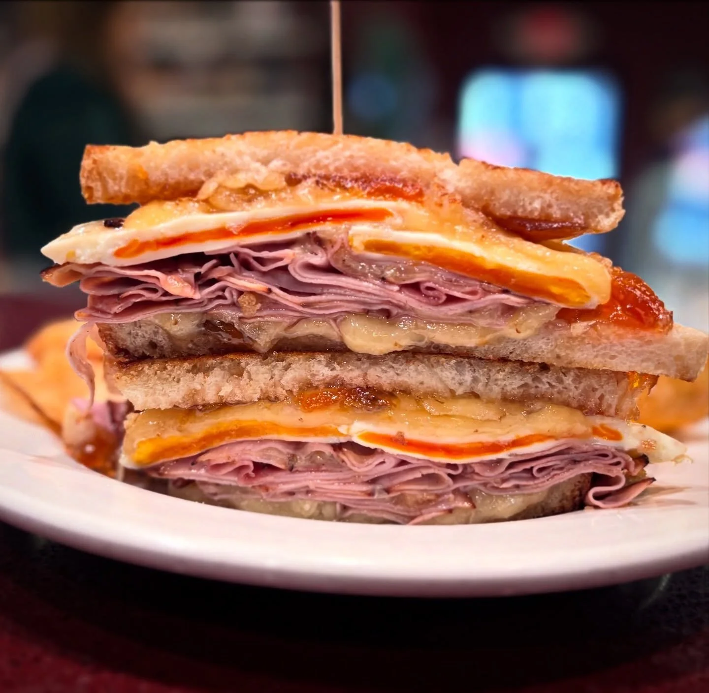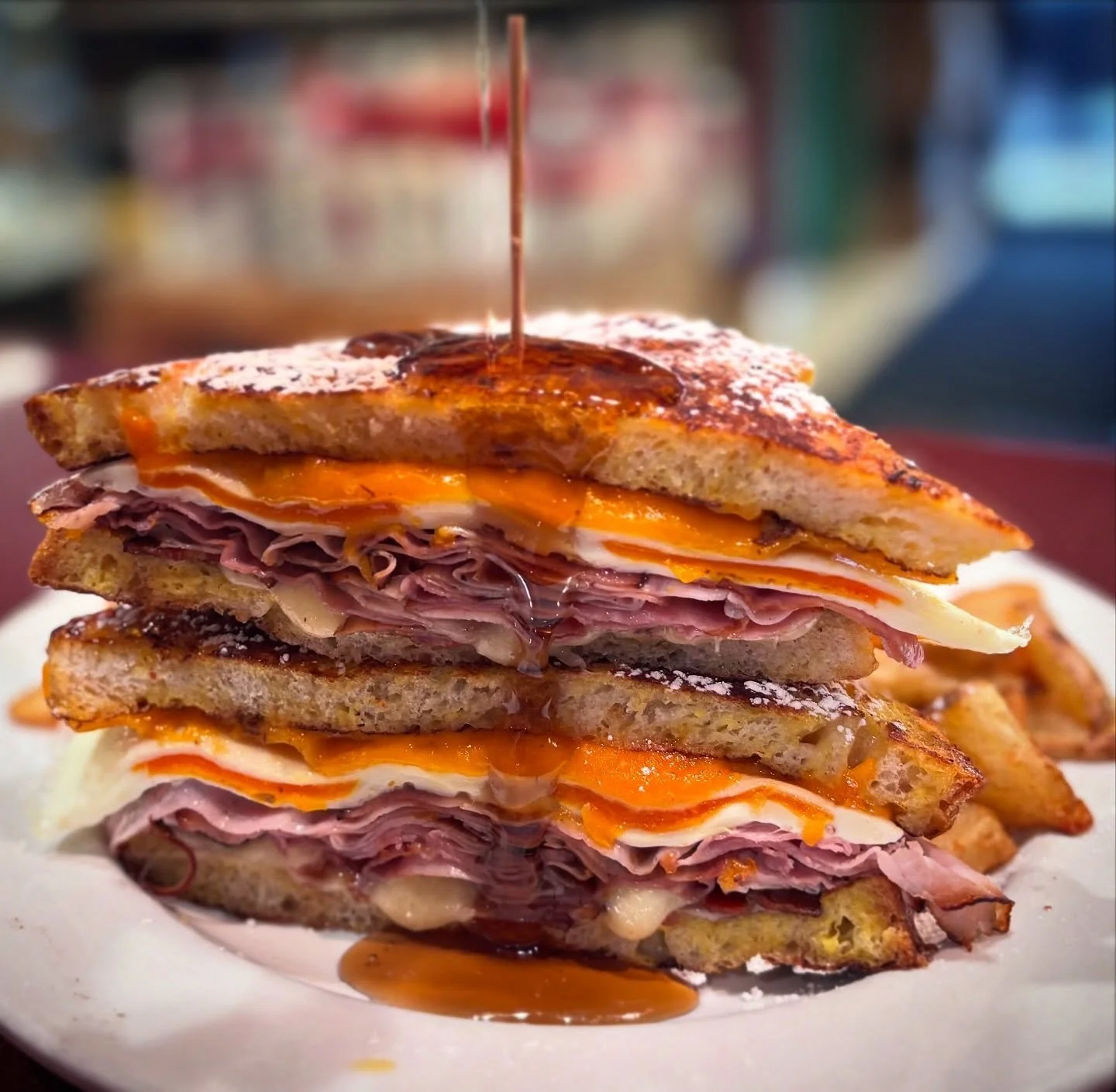 Ham, Bacon, Cheddar, Swiss, and a Fried Egg, grilled between French Toast!